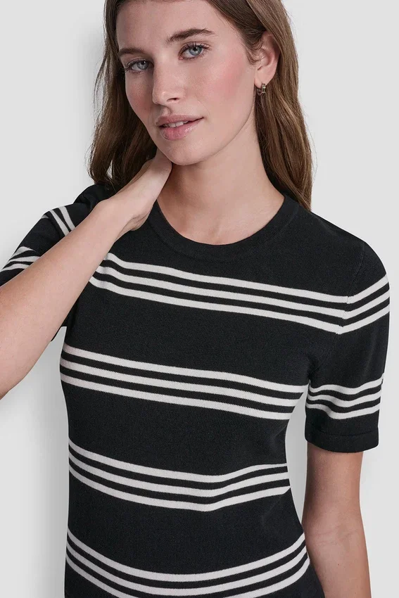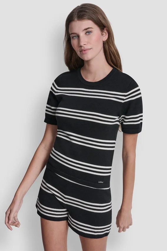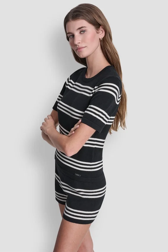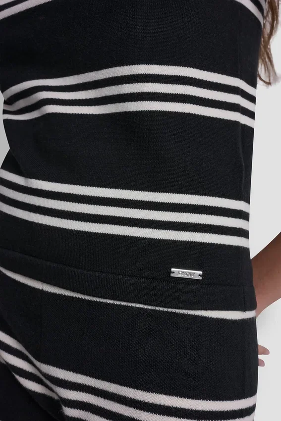 Timeless and Versatile, This Striped Crew Neck Sweater Features Elbow-Length Sleeves and a Polished Metal Logo Bar Detail. Crafted in a Soft Cotton-Viscose Blend, It’s a Refined Staple for Effortless Everyday Styling.