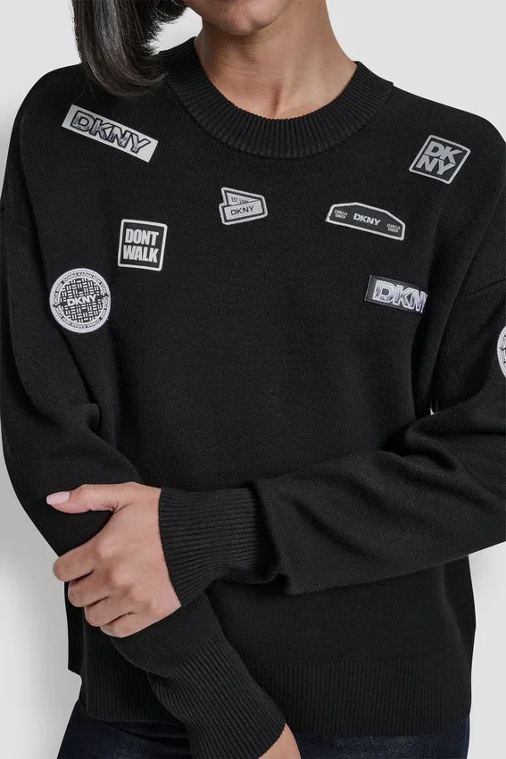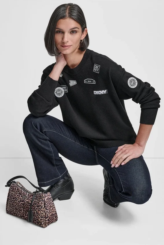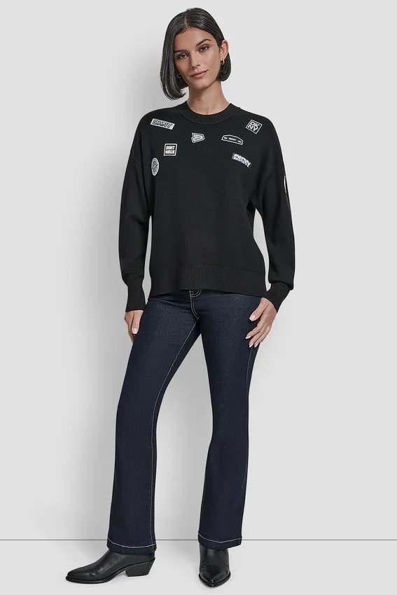 Playful Yet Polished, This Long-Sleeve Sweater Adds a Touch of Personality with Pin and Patch Details. Crafted in a Soft Rayon-Nylon Knit, It Blends Comfort with Modern Edge—Perfect for Layering or Making a Casual Statement on Its Own.