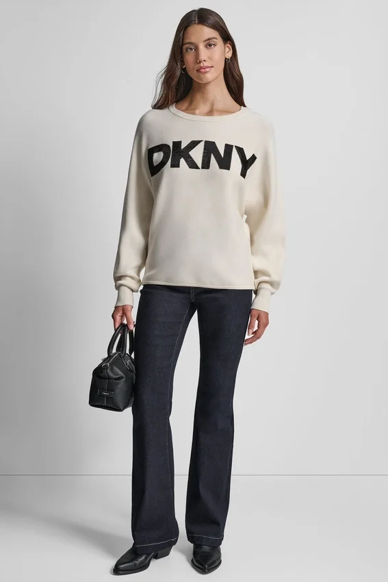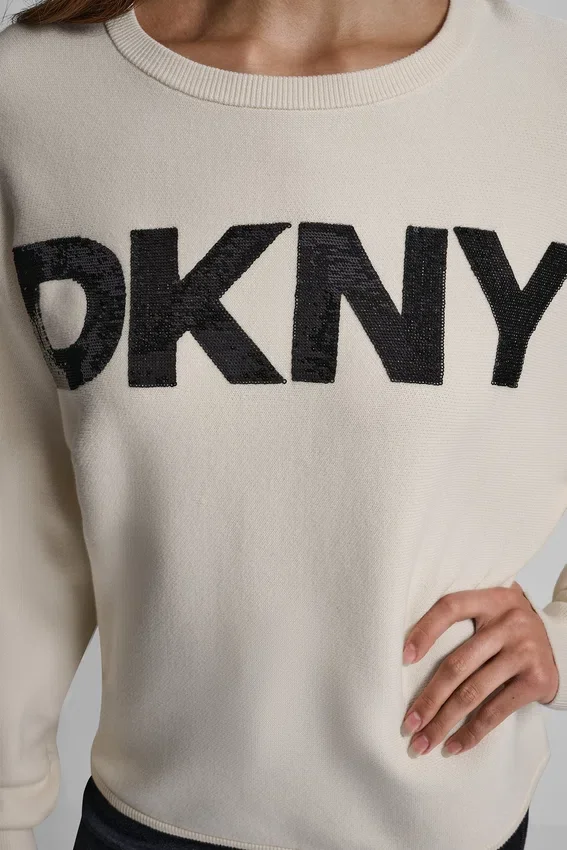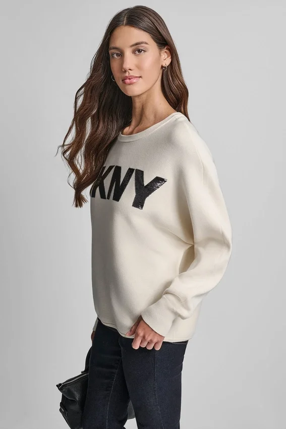 A Casual-Meets-Polished Sweater That Blends Relaxed Dolman Sleeves with a Touch of Sparkle from the Sequin Dkny Logo—Perfect for Dressing up Denim or Lounging in Style.