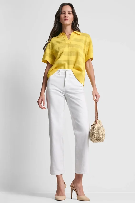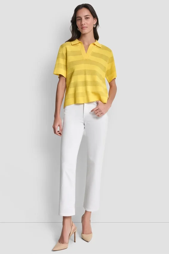 Light, Breathable, and Just a Little Flirty, This Sheer Striped Polo Sweater is Your Warm-Weather Knit Hero. The Airy Cotton-Blend Fabric Gives It That Effortless, Lived-In Feel, While Classic Stripes and a Soft Collar Keep the Look Polished.