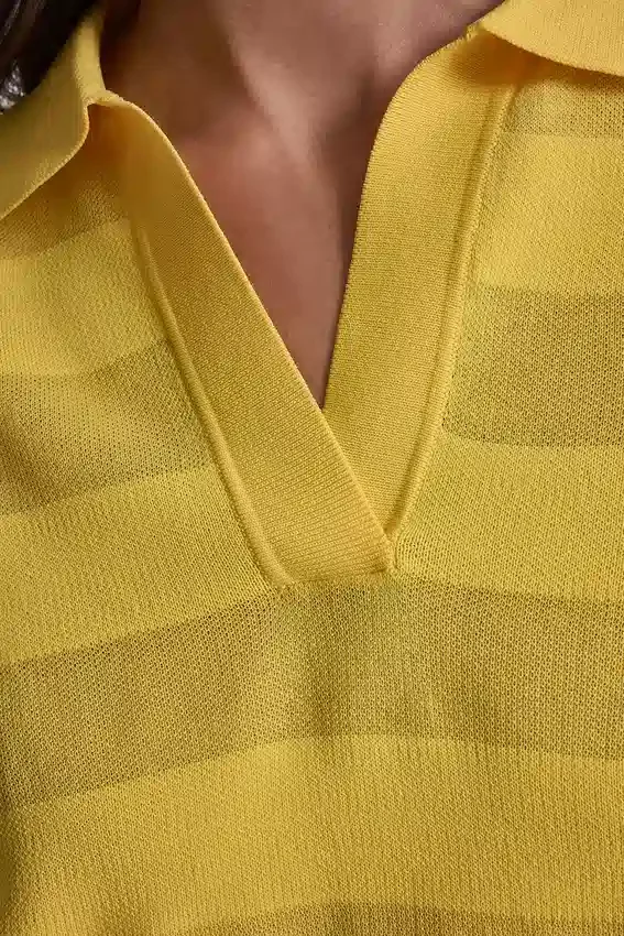 Sheer Striped Short-Sleeve Polo Sweater Lightweight Cotton-Blend Knit with an Airy Hand Feel Collared Neckline Unlined Fabric Content 50% Viscose Rayon, 31% Nylon, 14% Cotton, 5% Polyester Care Hand Wash Cold with Like Colors, Lay Flat to Dry, Cool Iron if Needed, Do Not Dry Clean Imported Style # P6Bsac64