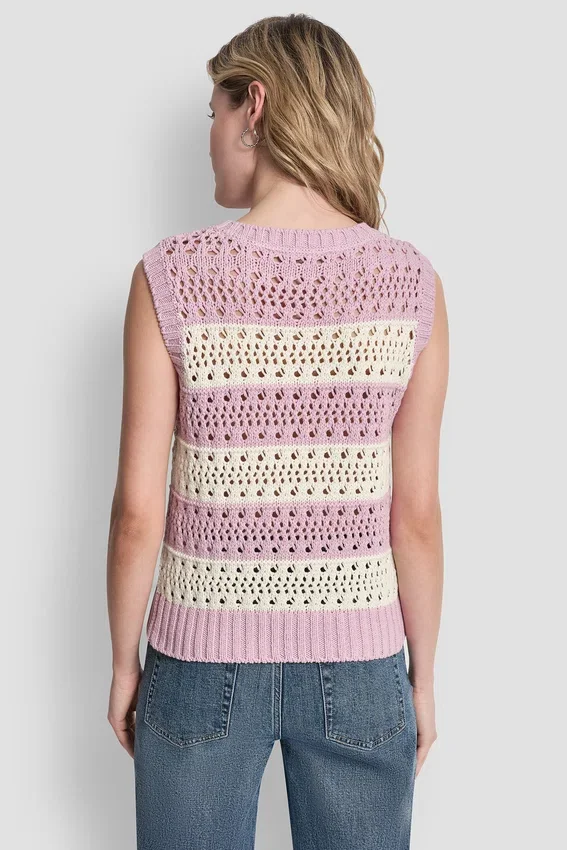 A Lightweight Knit with Refined Texture, This Sleeveless Striped Pointelle Sweater Features Contrast Logo Detailing for a Modern, Elevated Finish. Crafted in Breathable Cotton, It’s Perfect for Polished Layering or Warm-Weather Styling.