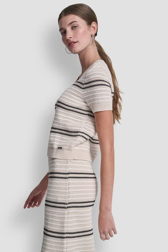 Classic with a Modern Touch, This Short Sleeve Sweater Features a Flattering Scoop Neckline and Striped Pointelle Stitch Detailing. A Subtle Logo Bar Adds a Polished Finish, Making It a Versatile Staple for Everyday Wear.