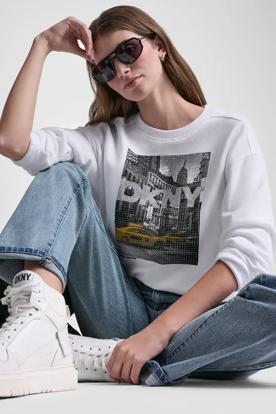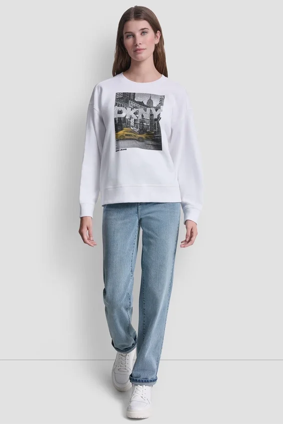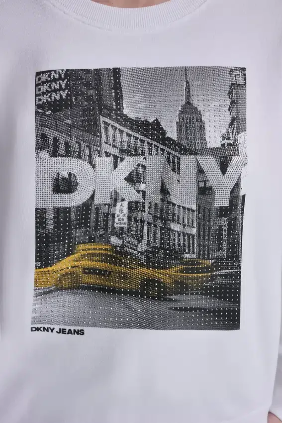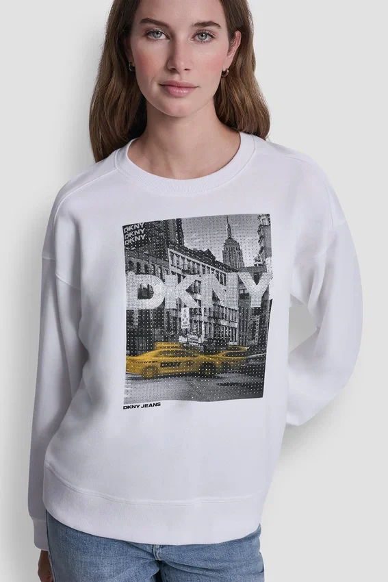 Bold and Statement-Making, This Crew Neck Sweatshirt Features a Photoreal Dkny Taxi Graphic Accented with Rhinestone Embellishment for Added Shine. Crafted in Soft Cotton with a Regular Fit, It Delivers Standout Style with Everyday Comfort.