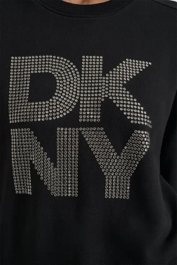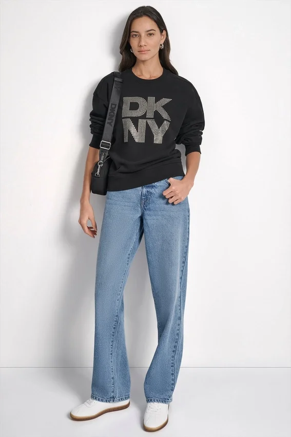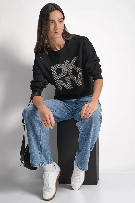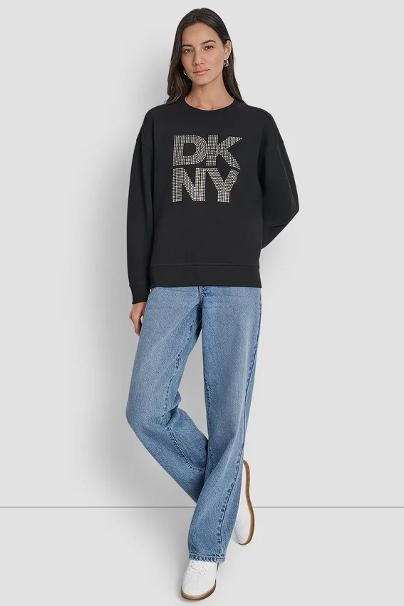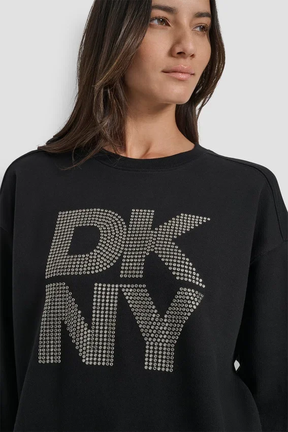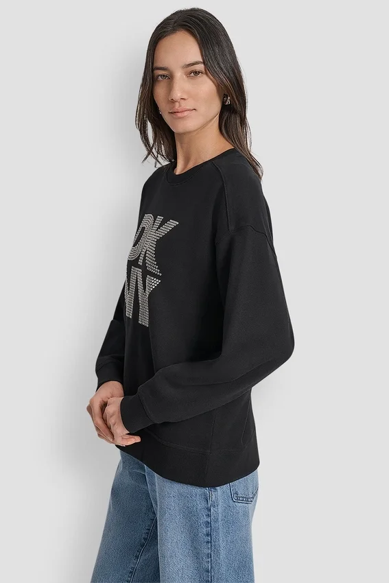 - Long Drop-Shoulder Sleeve Crew-Neck Crystal-Embellished Stacked Logo Sweatshirt