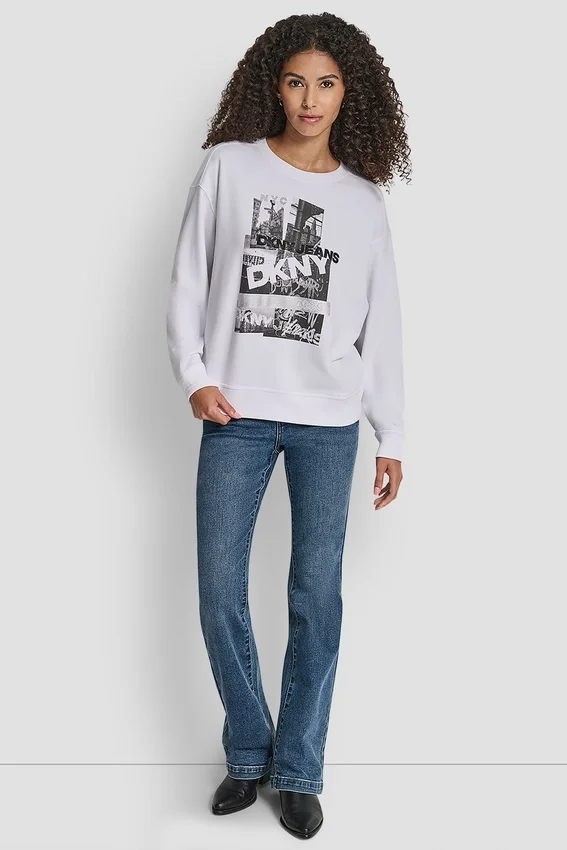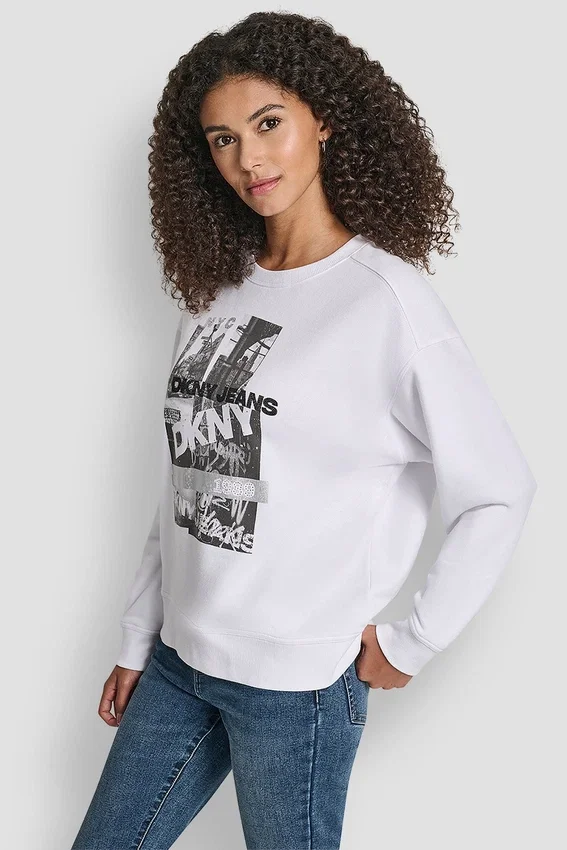 A City-Inspired Staple, This Crew Neck Sweatshirt Features a Photoreal Nyc Graphic Finished with Rhinestone and Foil Dkny Logo Detailing for a Bold, Street-Smart Edge.