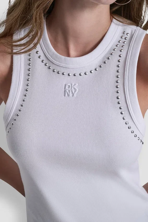 A Modern Essential with Subtle Edge, This Slim-Fit Tank is Accented with Dome Studs at the Neckline and Armholes for a Refined Statement. Crafted in a Soft Cotton-Blend Knit with Added Stretch, It Delivers All-Day Comfort with Elevated Detail.