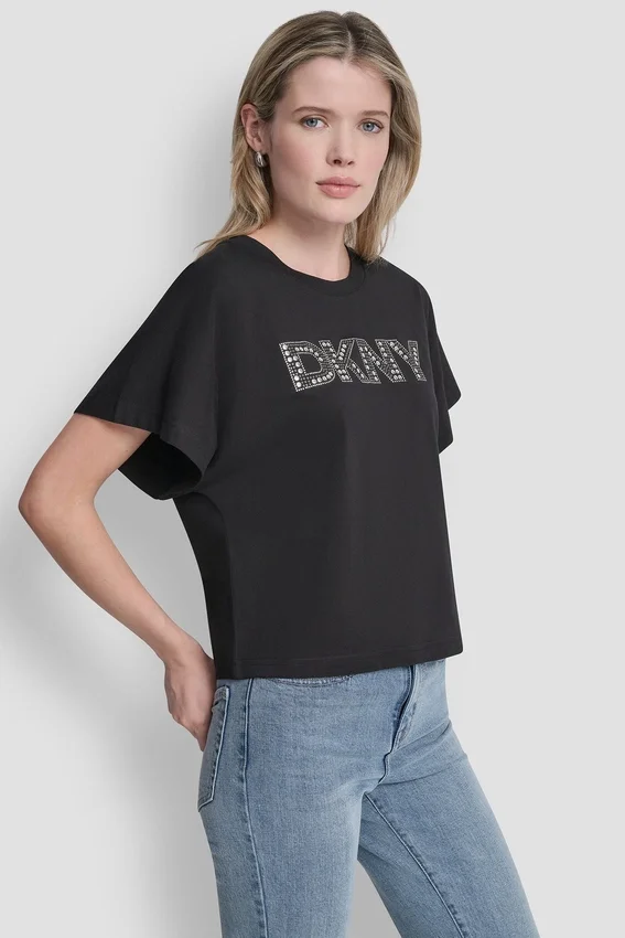 Short Wide Sleeve Crew-Neck Crystal-Embellished Logo T-Shirt