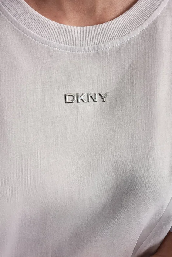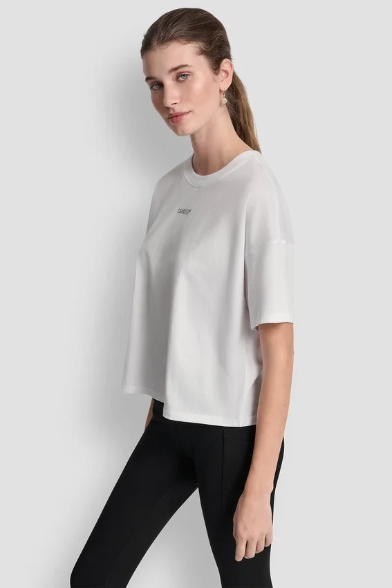 - Short Drop-Shoulder Sleeve Crew-Neck Metallic Bubble Logo-Embellished T-Shirt