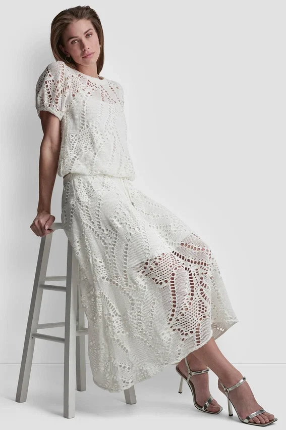 - Short Puff Sleeve Crew-Neck Crochet Leaf Top
