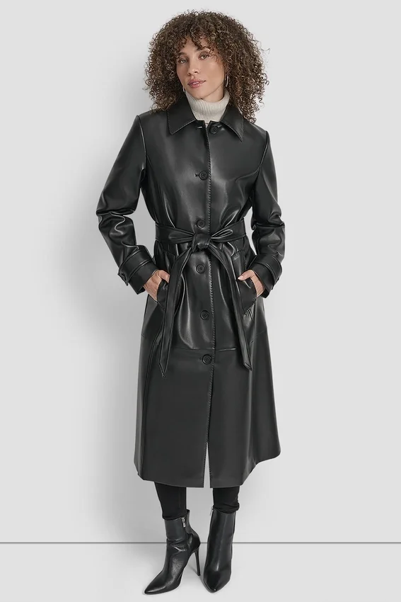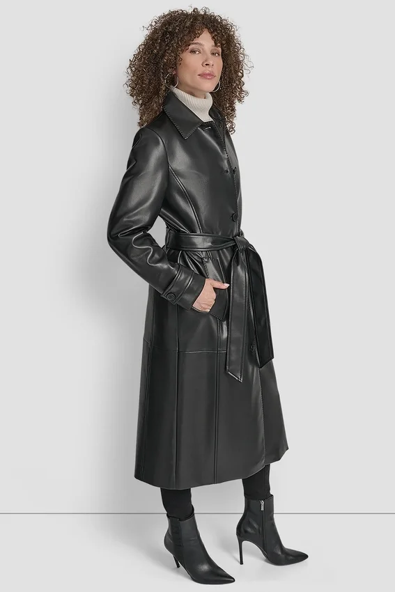 Timeless and Modern, This Sleek Longline Jacket in Supple Faux Leather Defines Effortless Urban Sophistication—Cinched at the Waist with a Belt for a Flattering Silhouette That Transitions Seamlessly from Day to Night.