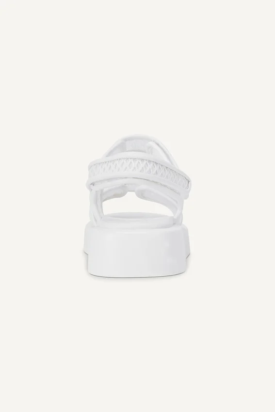 A Standout Seasonal Staple, These Platform Slides Nail the Peekaboo Trend—Perfect Under an Open-Stitch Logo Sweater Layered over a Bralette and Shorts.